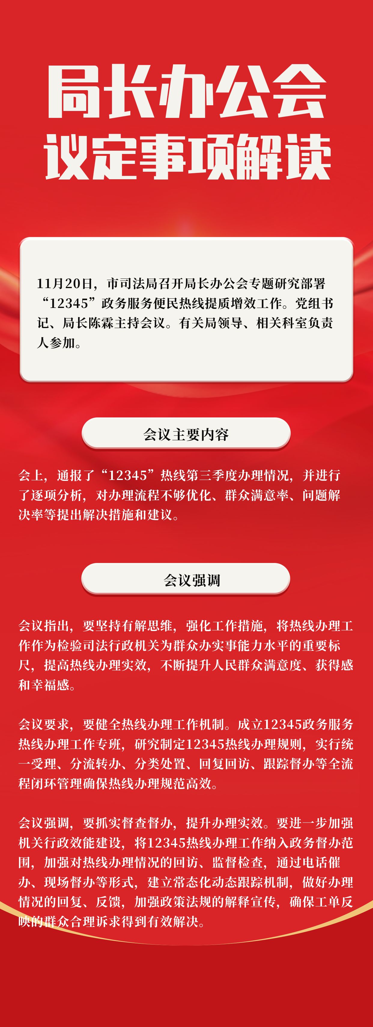 会议要求,要健全热线办理工作机制。成立由分管领导牵头,办公室揽总,各业务科室共同参与的市司法局12345政务服务热线办理工作专班,进一步完善全局12345热线办理责任体系,推进形成主要领导亲自抓、分管领导靠上抓、办公室牵头抓、承办科室具体抓的工作格局。用心用情加强沟通,认真落实首办责任,积极摆正服务态度,用最短时间、最快速度、最佳结果答复群众。对条件不成熟暂时不能解决的做好与来电人的沟通解释,对不属于本单位职责范围的,告知来电人救济渠道,并引导当事人向有关部门反映,确保做到“事事有回音、件件有答复”。研究制定12345热线办理规则,明确受理范围、重点任务、办理要求、办理时限,优化办理流程,实行统一受理、分流转办、分类处置、回复回访、跟踪督办等全流程闭环管理,进一步分解任务,压实工作责任,确保热线办理规范高效。