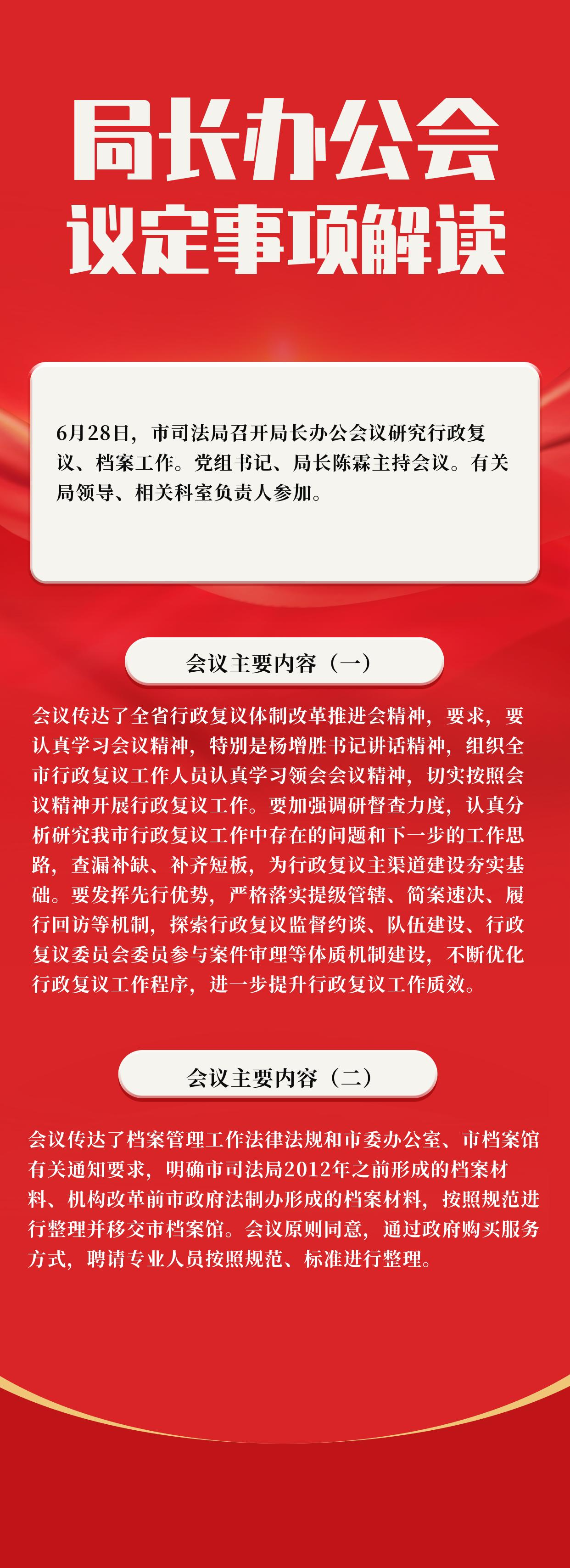 6月28日,市司法局召开局长办公会议研究行政复议、档案工作。党组书记、局长陈霖主持会议。有关局领导、相关科室负责人参加。