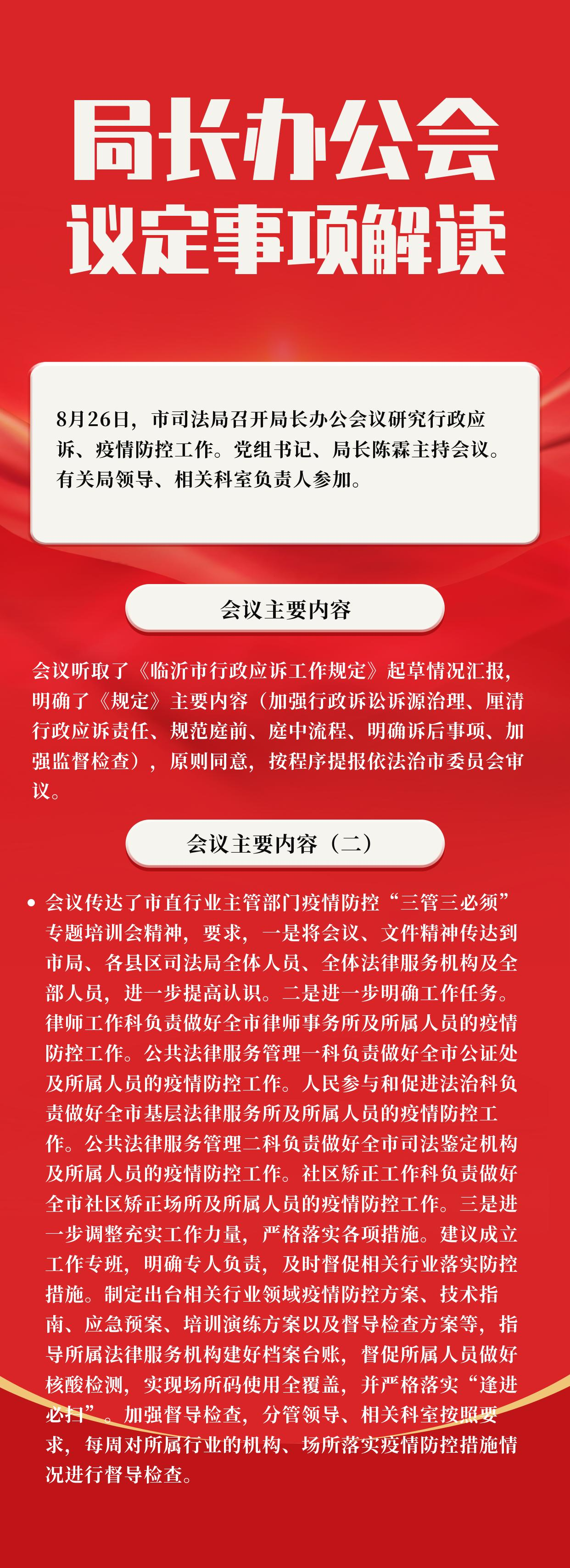 8月26日,市司法局召开局长办公会议研究行政应诉、疫情防控工作。党组书记、局长陈霖主持会议。有关局领导、相关科室负责人参加。