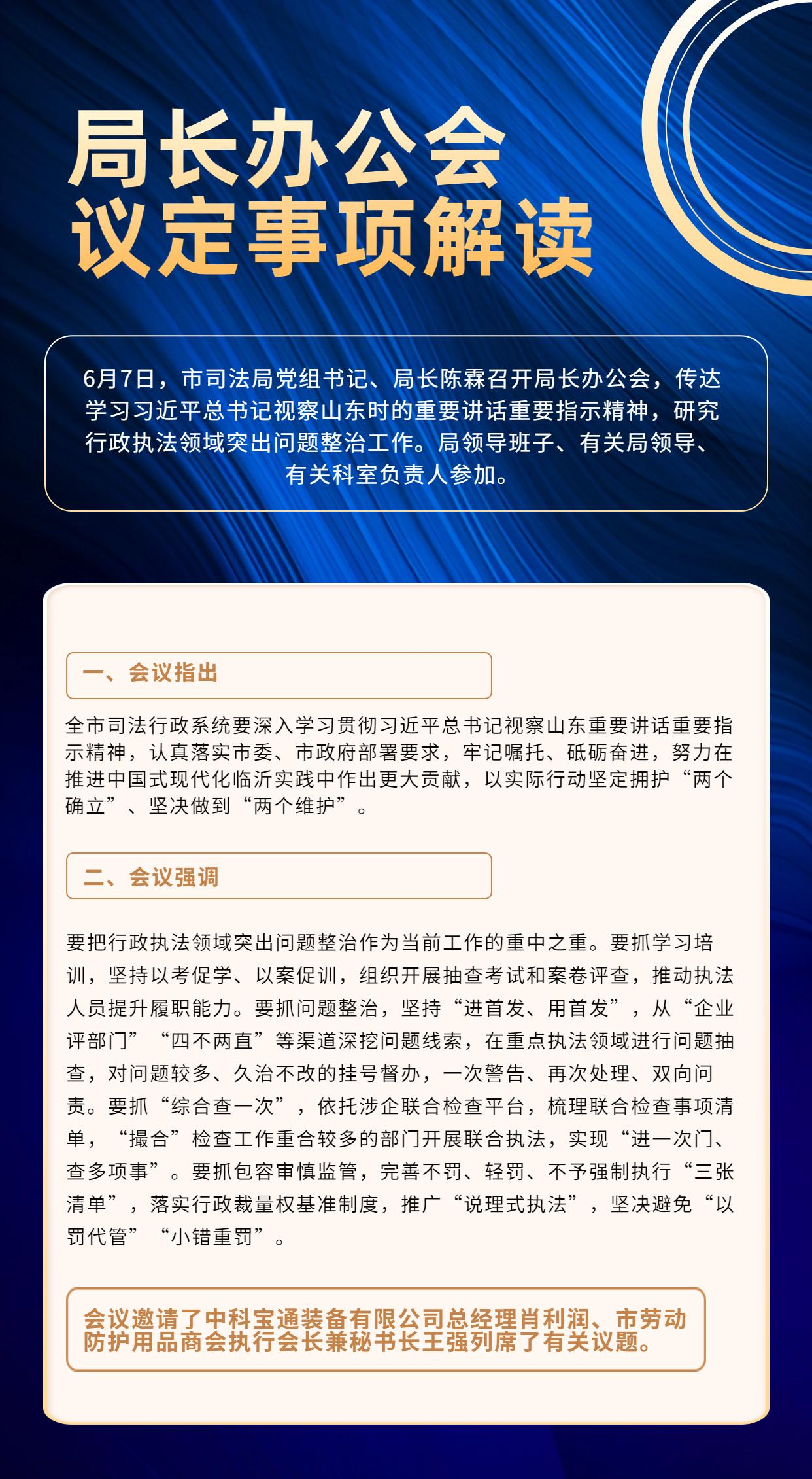6月7日,市司法局党组书记、局长陈霖召开局长办公会,传达学习习近平总书记视察山东时的重要讲话重要指示精神,研究行政执法领域突出问题整治工作。局领导班子、有关局领导、有关科室负责人参加。