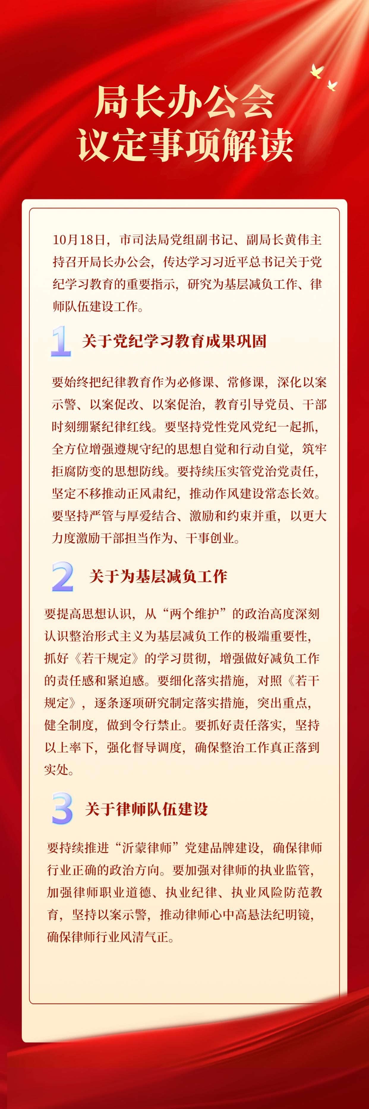 10月18日,市司法局党组副书记、副局长黄伟主持召开局长办公会,传达学习习近平总书记关于党纪学习教育的重要指示,研究为基层减负工作、律师队伍建设工作。