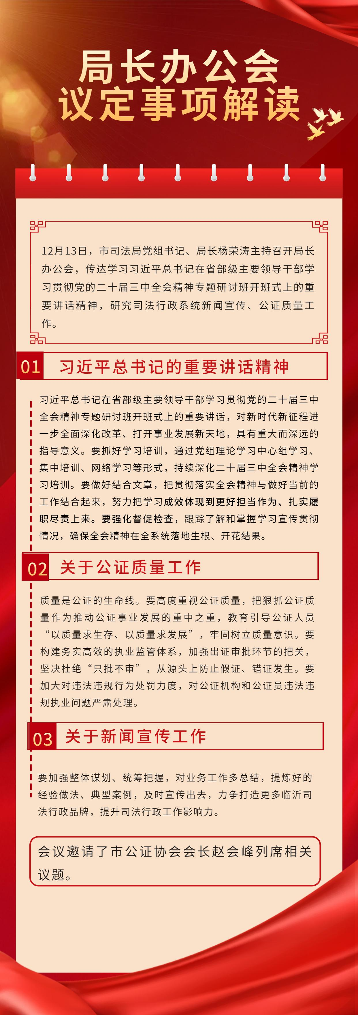 12月13日,市司法局党组书记、局长杨荣涛主持召开局长办公会,传达学习习近平总书记在省部级主要领导干部学习贯彻党的二十届三中全会精神专题研讨班开班式上的重要讲话精神,研究司法行政系统新闻宣传、公证质量工作。